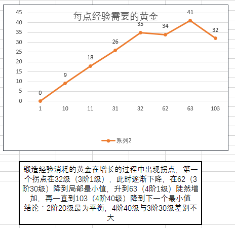 所以这里把黄金/经验比做竖轴,把级别做横轴画了一张图: